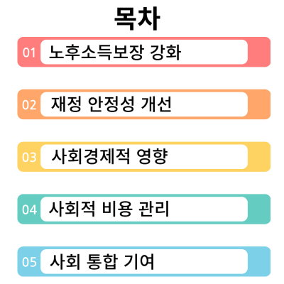 • 연금개혁을 통해 세대 간 연금 부담의 형평성을 개선하여 사회 통합에 기여할 수 있습니다.