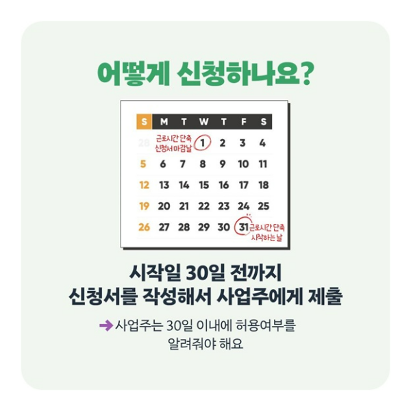 근로자는 단축 시작 30일 전까지 사업주에게 신청서를 제출. - 사업주 통보: