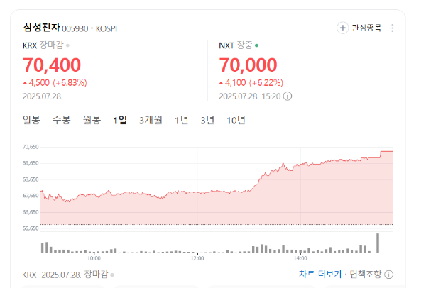 | 삼성전자 | 67,850원 | +3.5% ↑ | [실시간 삼성전자 주가 보기 |