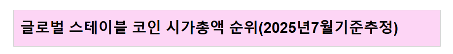 | USDT | 테더(Tether Ltd) | 법정화폐 기반(현금+유사자산) | 가장 많이 사용됨, 글로벌 점유율 1위 |