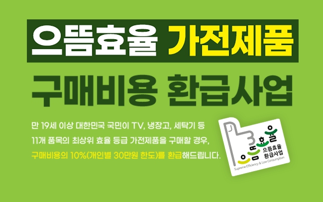 ✅ 고효율 가전제품(11종) 구매 시, 구매금액의 10%를 환급해주는 정부 지원 사업. 1인당 최대 30만 원 한도, 2025년 7월 4일 이후 구매품목만 해당. |