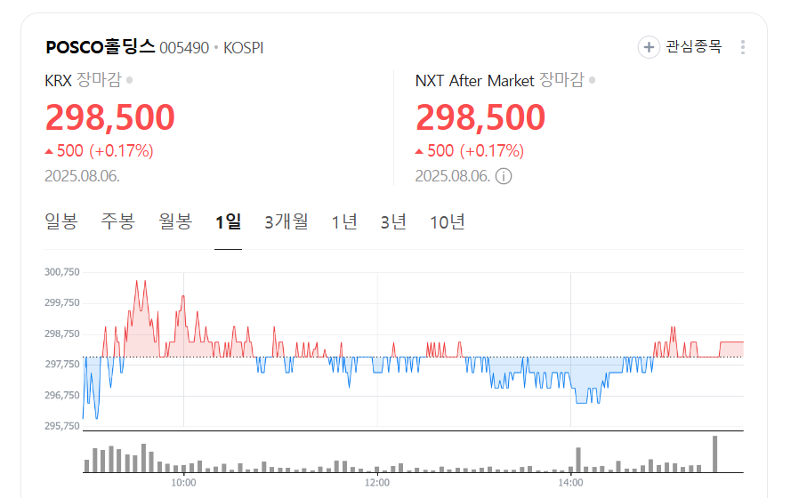 | 포스코홀딩스 (005490) | 298,000원 | ▲ 2.76% | 철강 업황 호조 기대감이 사고 영향 상쇄 |